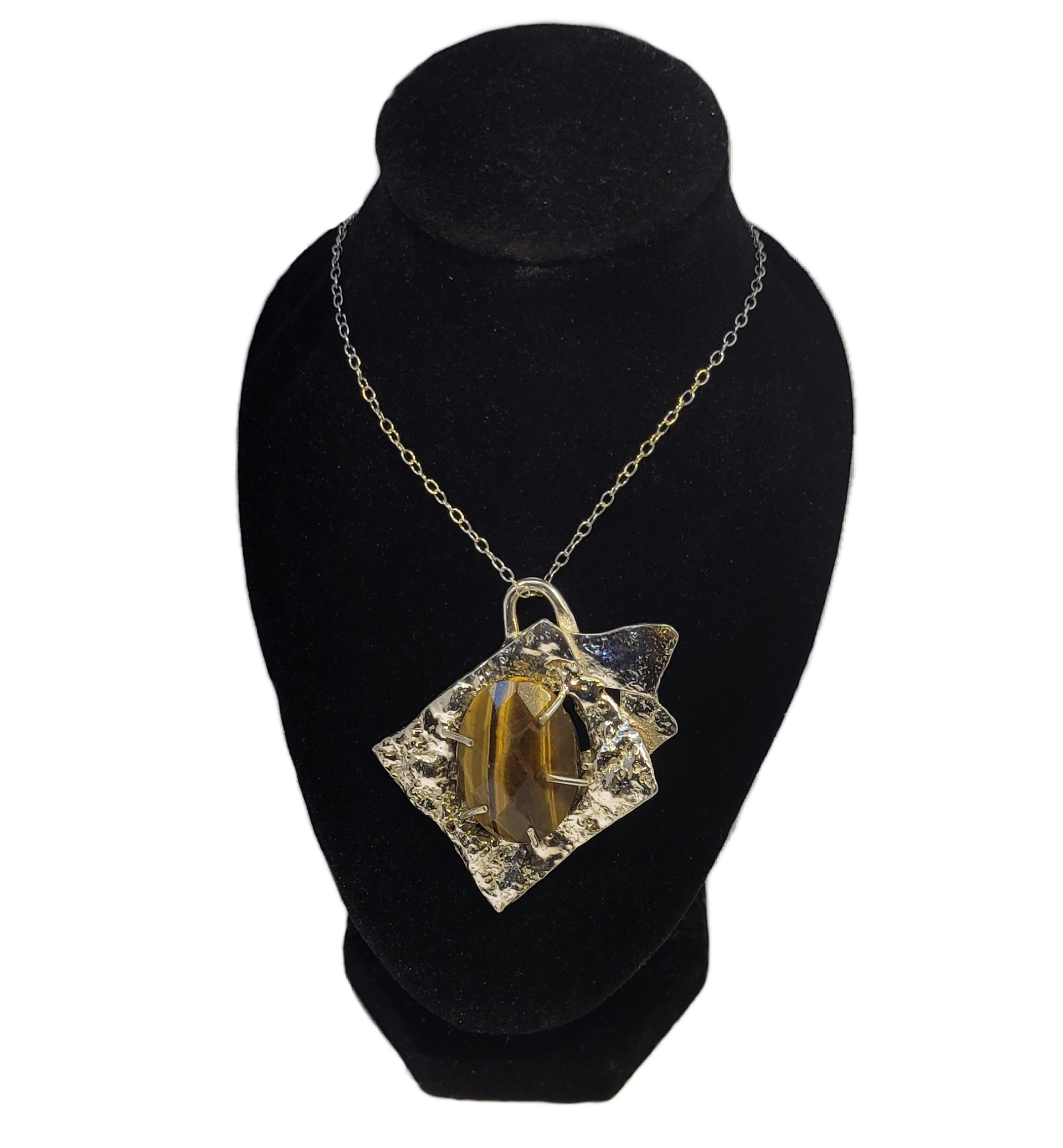 The centrepiece is a large, polished Tiger's Eye gemstone, cut into a faceted oval cabochon. Its signature bands of golden, caramel, and deep brown shimmer with captivating chatoyancy, creating the illusion of a moving, watchful eye.