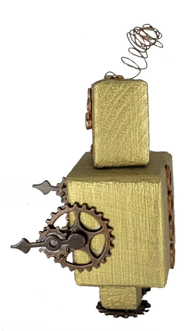Squeaky Sprocket is a charmingly anxious automaton with a permanent case of the jitters. His stout, block-shaped body is painted a vibrant metallic gold, giving him a classic 1950s sci-fi aesthetic. His head is mounted slightly askew, and features one large, worried gear-eye and one small, frantic washer-eye, framed by a tiny copper-wire antenna that twitches with existential dread. His body is adorned with a prominent copper gear design, suggesting a motor that runs purely on nervous energy. With small copper feet and a pair of hesitant chain "arms," Squeaky looks ready to apologize for whatever minor offence he is about to commit.