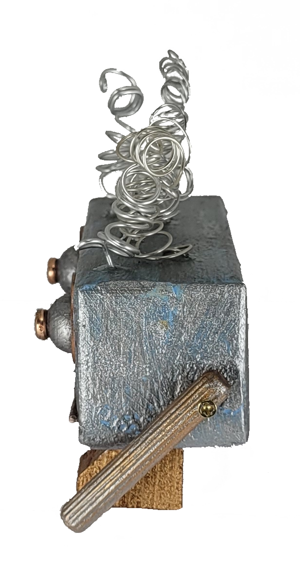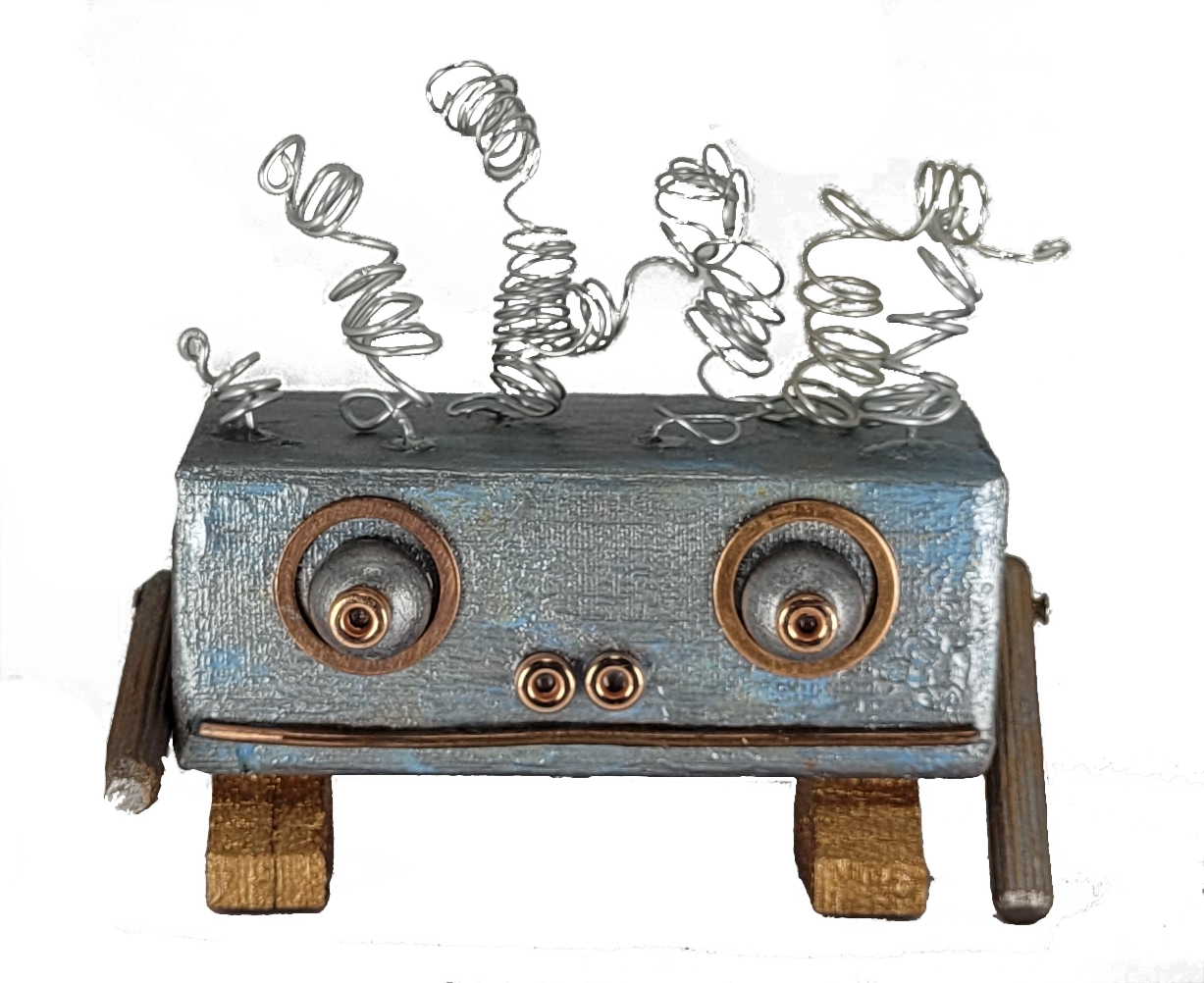 Professor Gizmohead is a robot of profound, if slightly disorganized, thought. His sturdy, rectangular body is painted a wonderfully distressed metallic blue and silver, giving him a vintage, weathered charm. His face features large, comically wide googly-style eyes (crafted from copper-ringed silver balls) that seem to absorb all information with startled fascination. Below, a row of three tiny copper studs forms a minimalist, slightly puzzled nose, while his mouth is a simple, straight copper line, betraying no emotion beyond quiet bewilderment.
