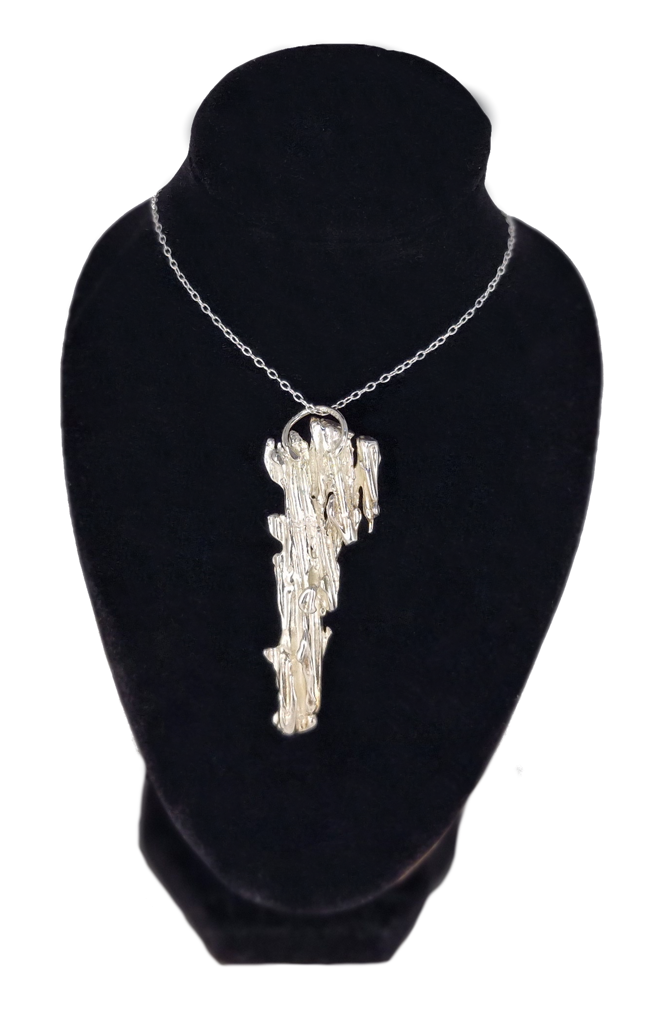 The Vertical Current pendant is a commanding piece of sculptural jewellery, defined by its extreme verticality and texture. Crafted entirely from Sterling Silver, the piece features an elongated, abstract, and irregular shape that mimics a powerful downward flow or a natural formation like a stalactite (Find out how it was made here). The entire surface is finished with our signature rugged, heavily textured, and organic molten finish. This Forge Tower-like piece is a bold statement, embodying primal energy and the continuous motion of nature.